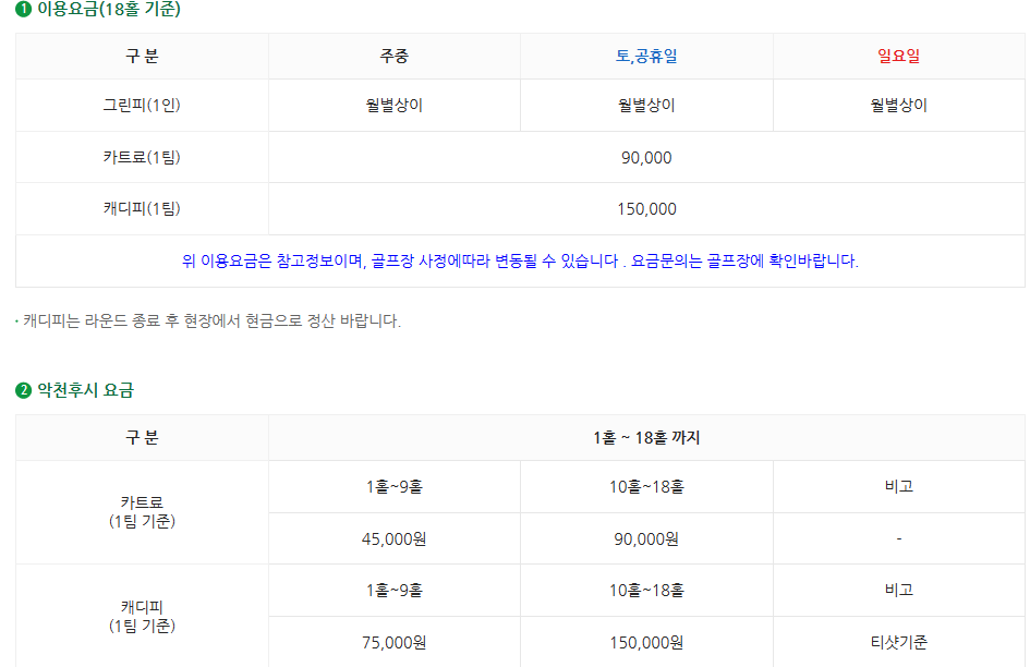 코스 요금 (그린피 18만 9천 원, 캐디피 15만 원, 카트비 9만 원)
