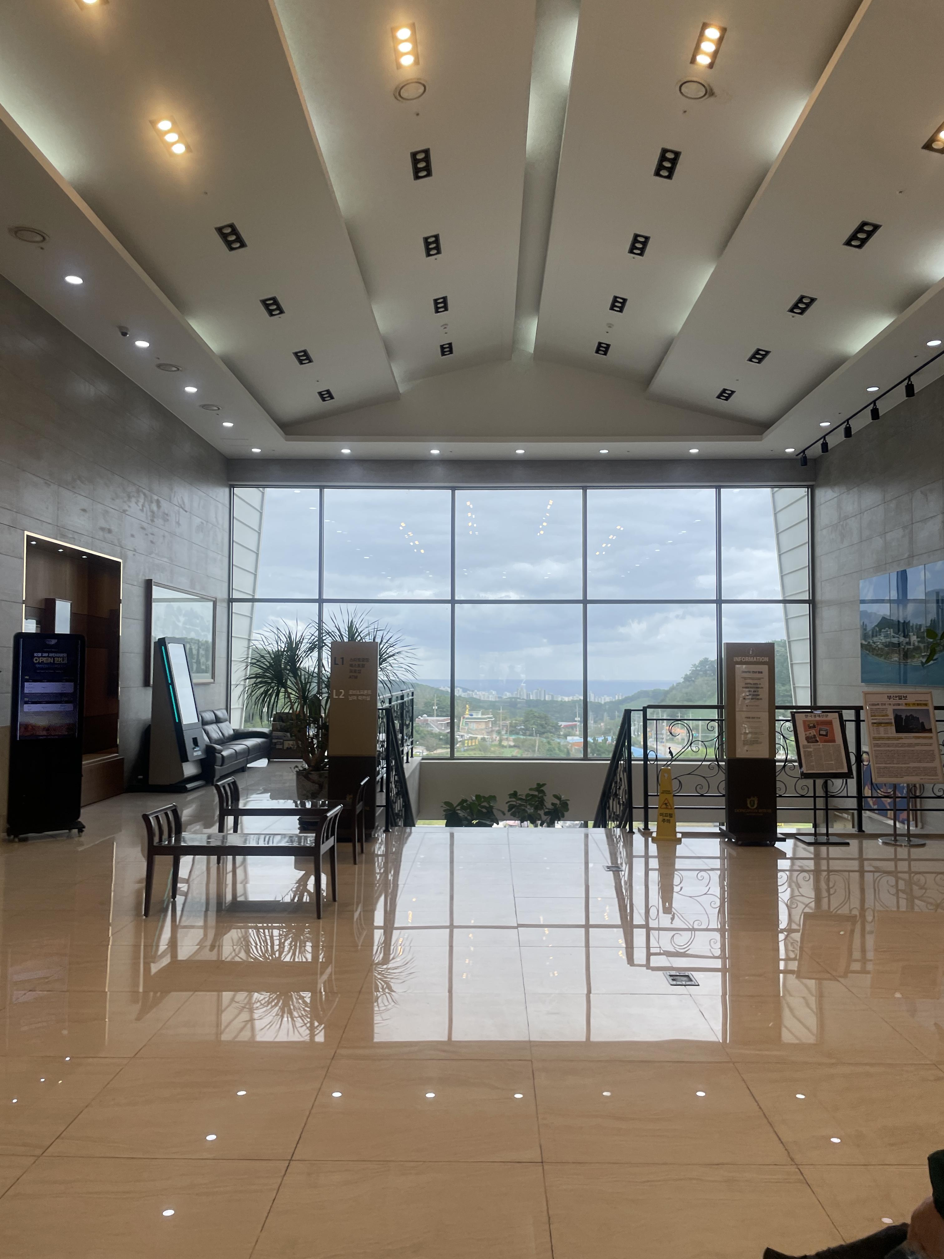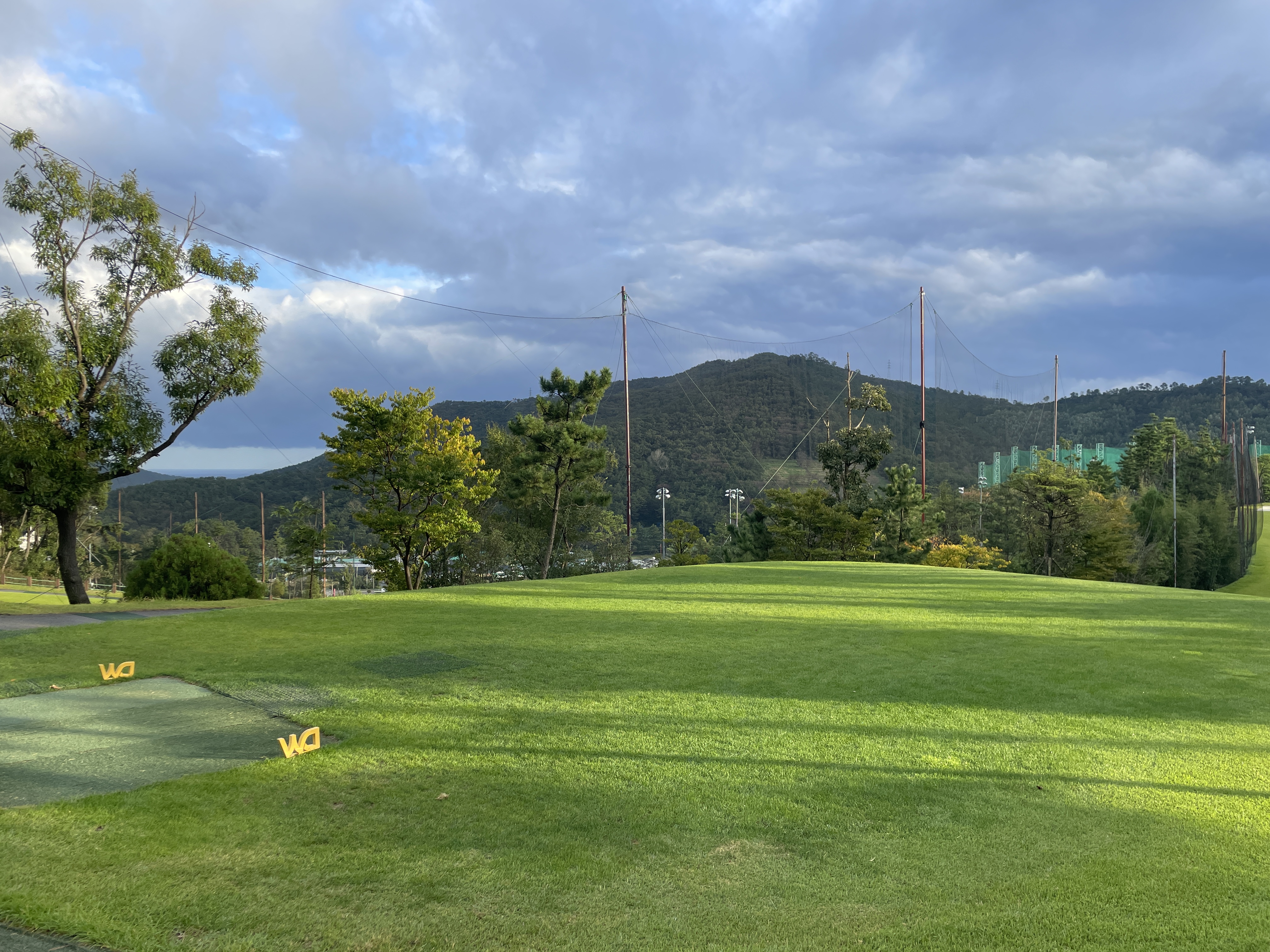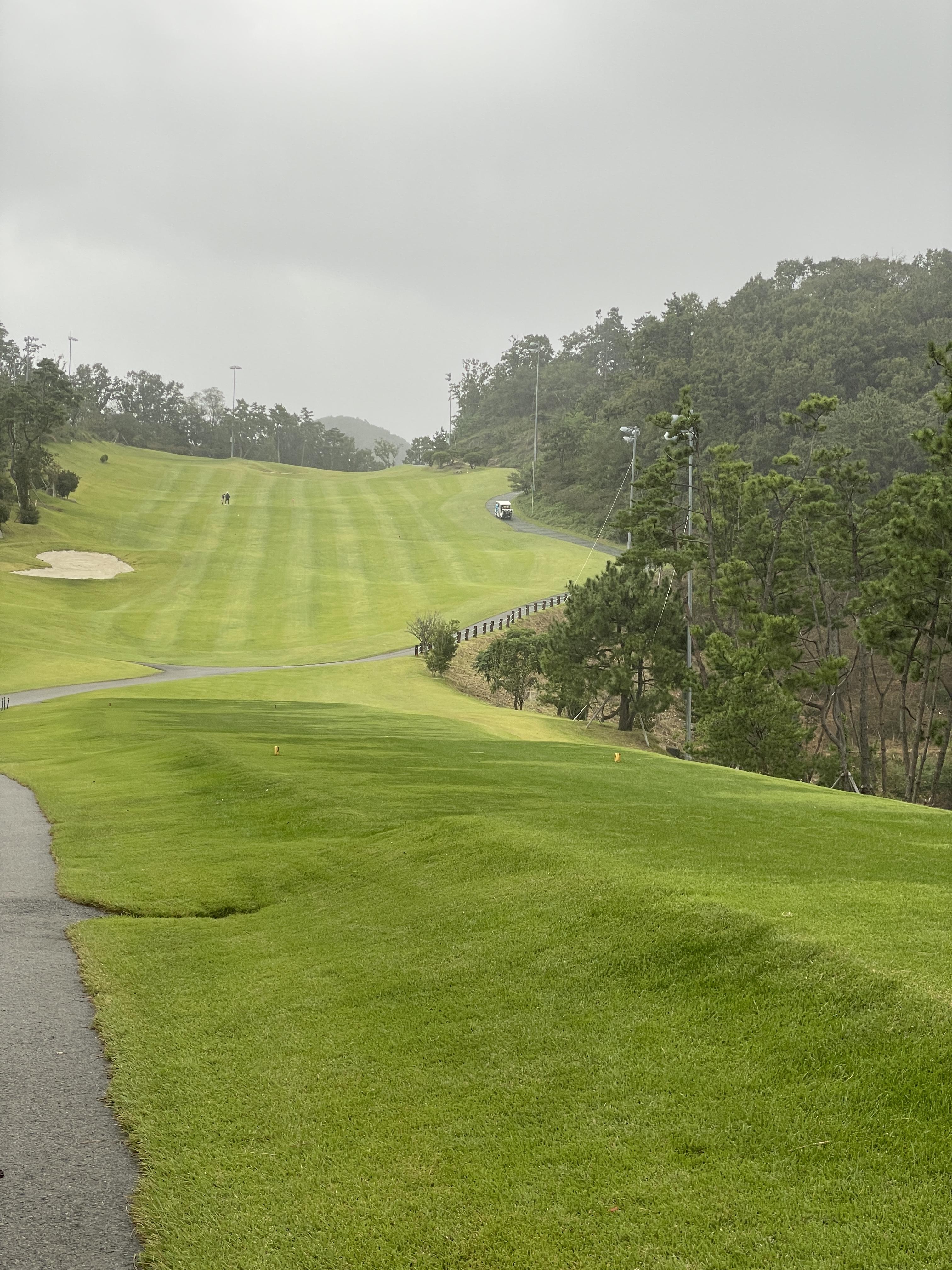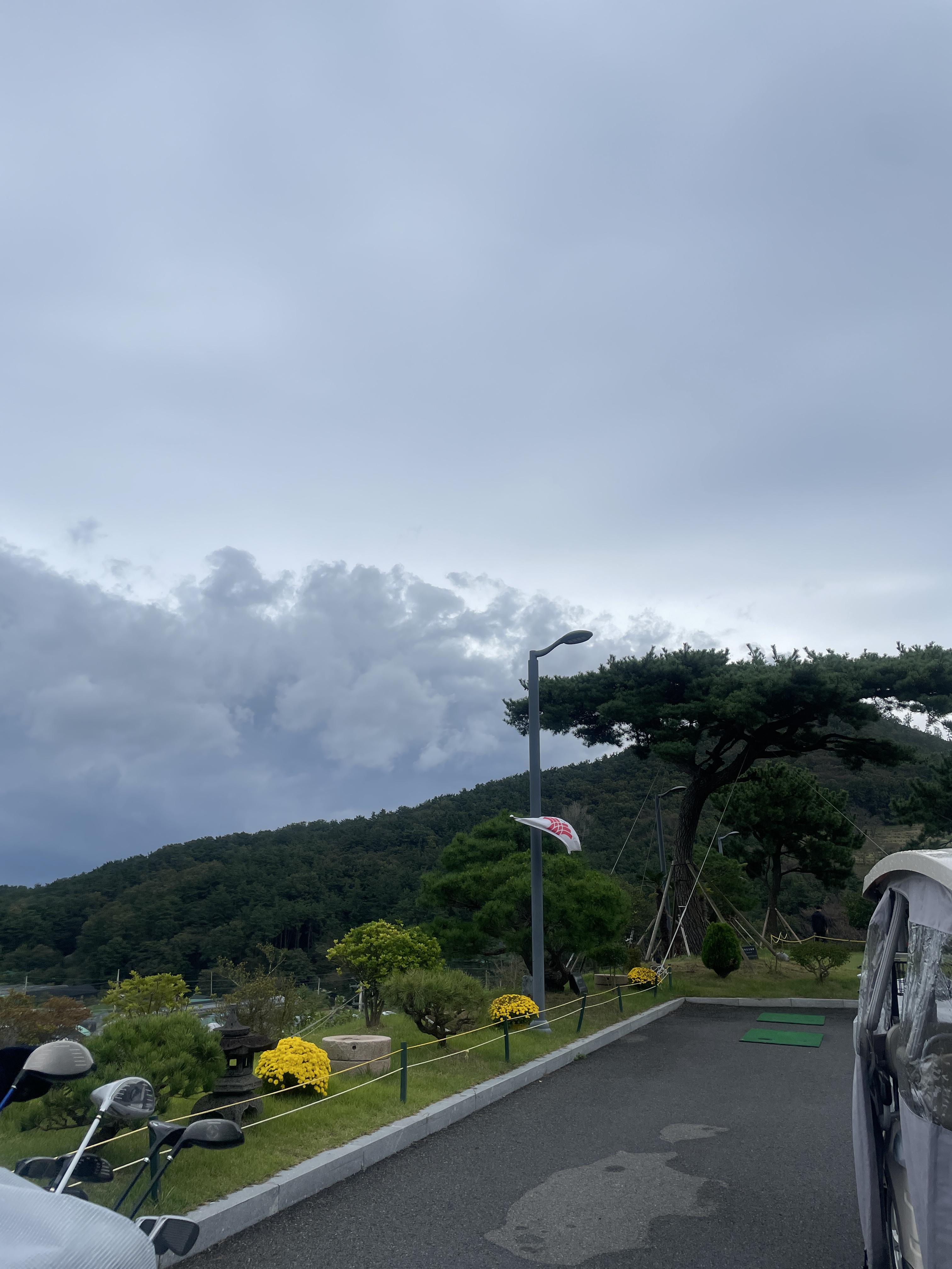 클럽하우스 1층으로 내려오면 스타트 지점에서 카트를 기다립니다. 전경으로는 산속에 구장이 있는 것 같지는 않았고 도시뷰이고, 도로들과 주택가? 와 가까운 느낌이었습니다. 그래서 차도 소리도 좀 났습니다. 도심 속 9홀 구장! 기장 동원로얄컨트리클럽에서는 기장의 앞바다가 저 멀리 보였습니다.기장동원로얄CC는 바다가 보이는 sea side구장이어서 신기했습니다.