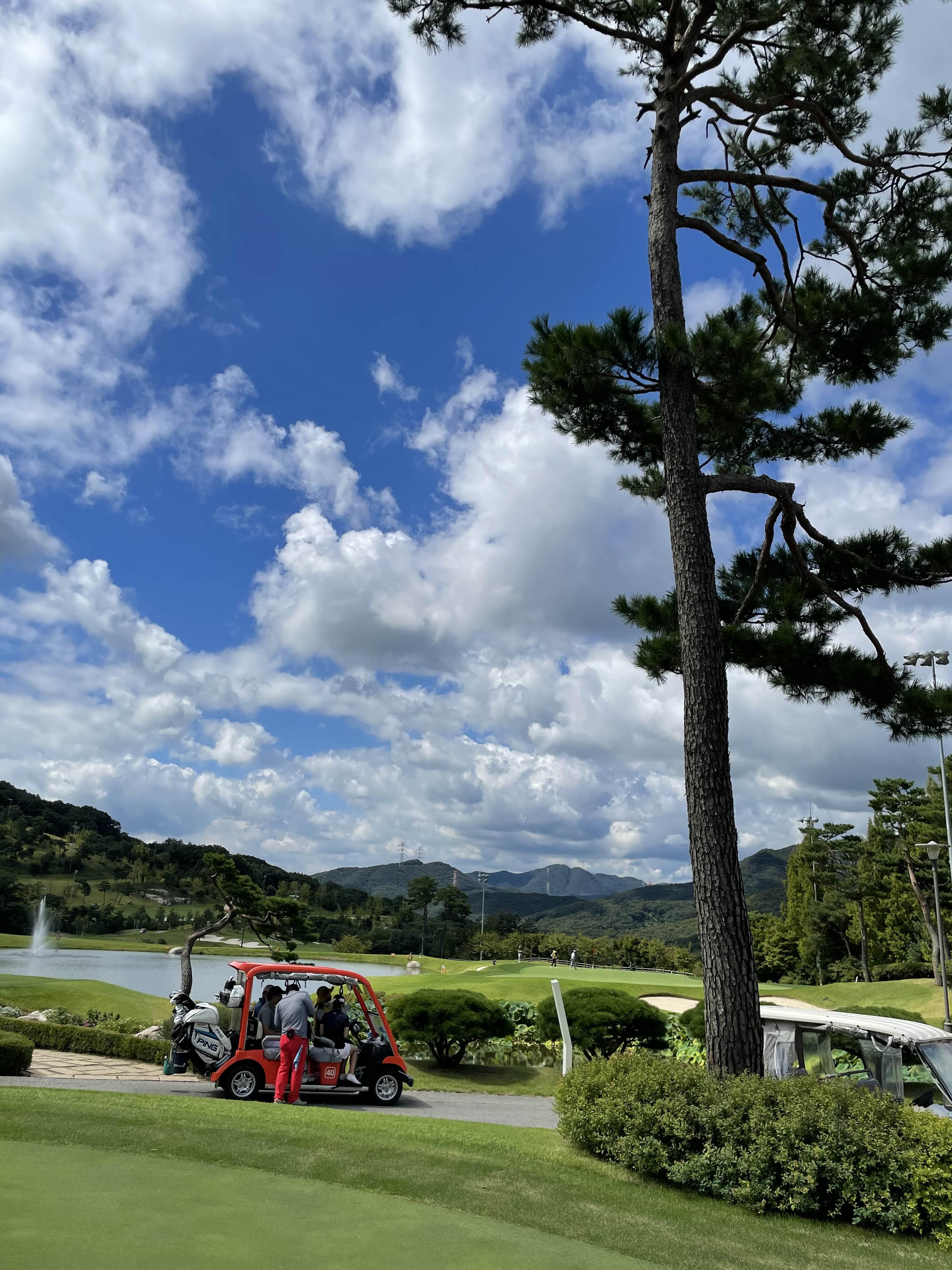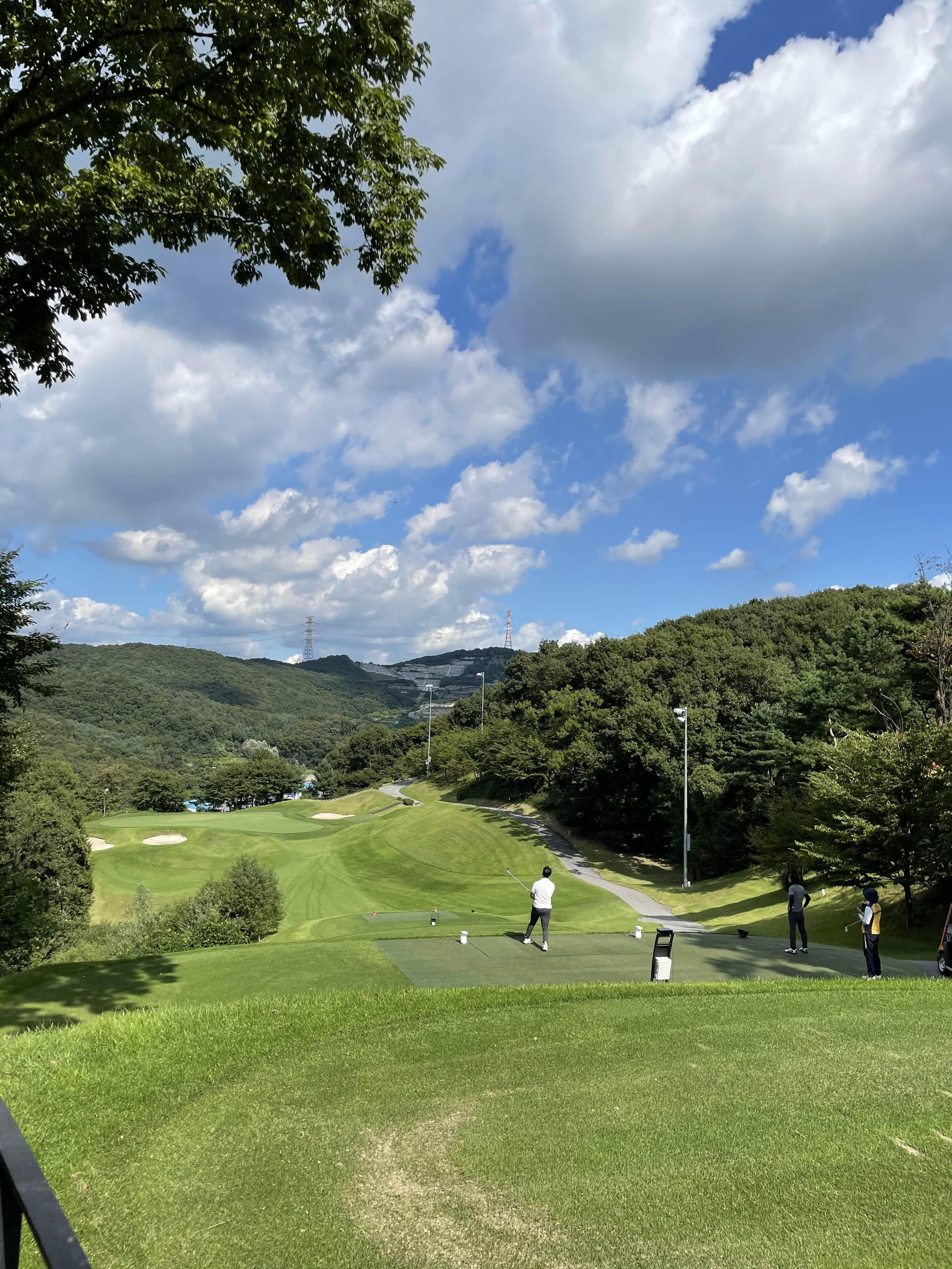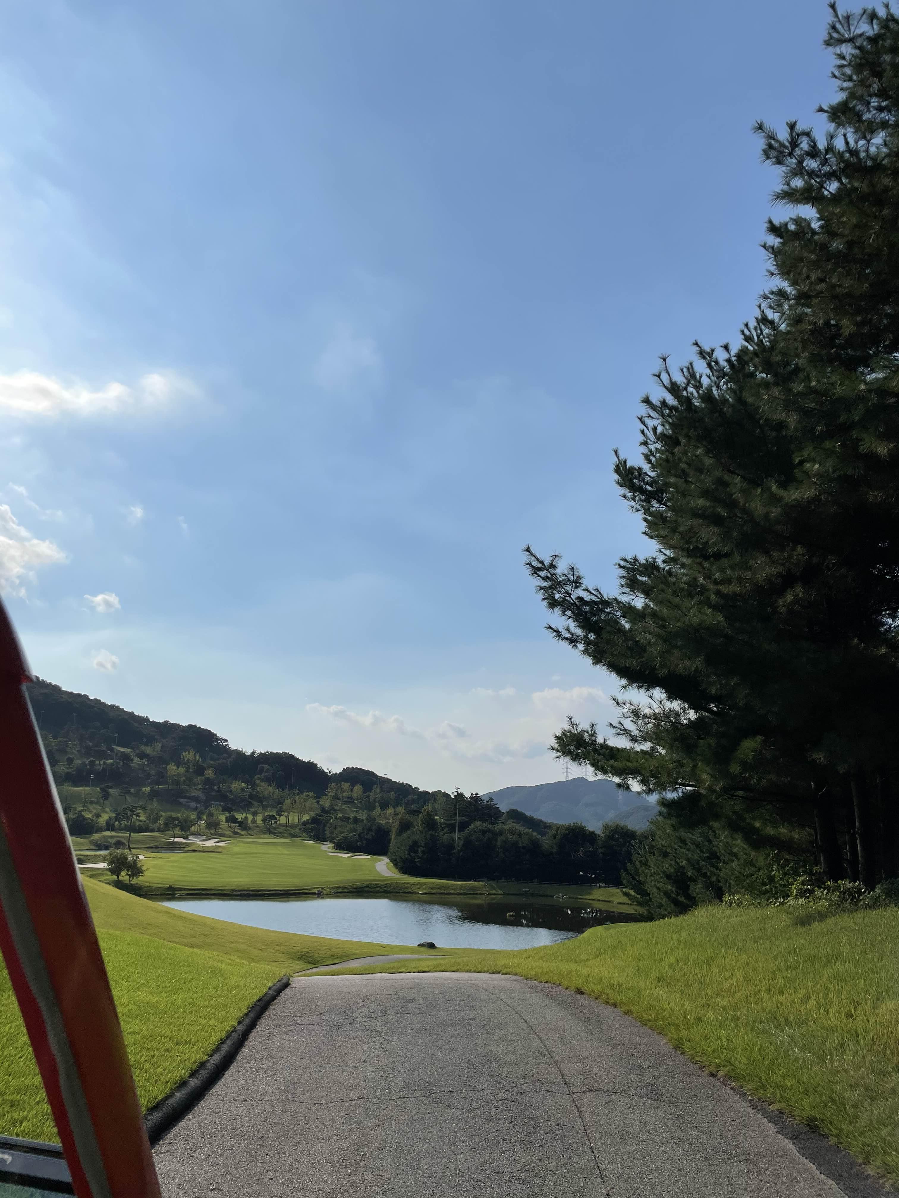 티샷 준비를 하면서 풍경을 바라보는 것도 좋습니다. 너무 멋있었습니다. 티잉그라운드는 매트가 아닌 잔디로 된 티박스였습니다. 아무래도 매트와 잔디 티박스는 디테일하면서 구장의 퀄리티를 높일 수 있는 부분이라고 생각합니다.