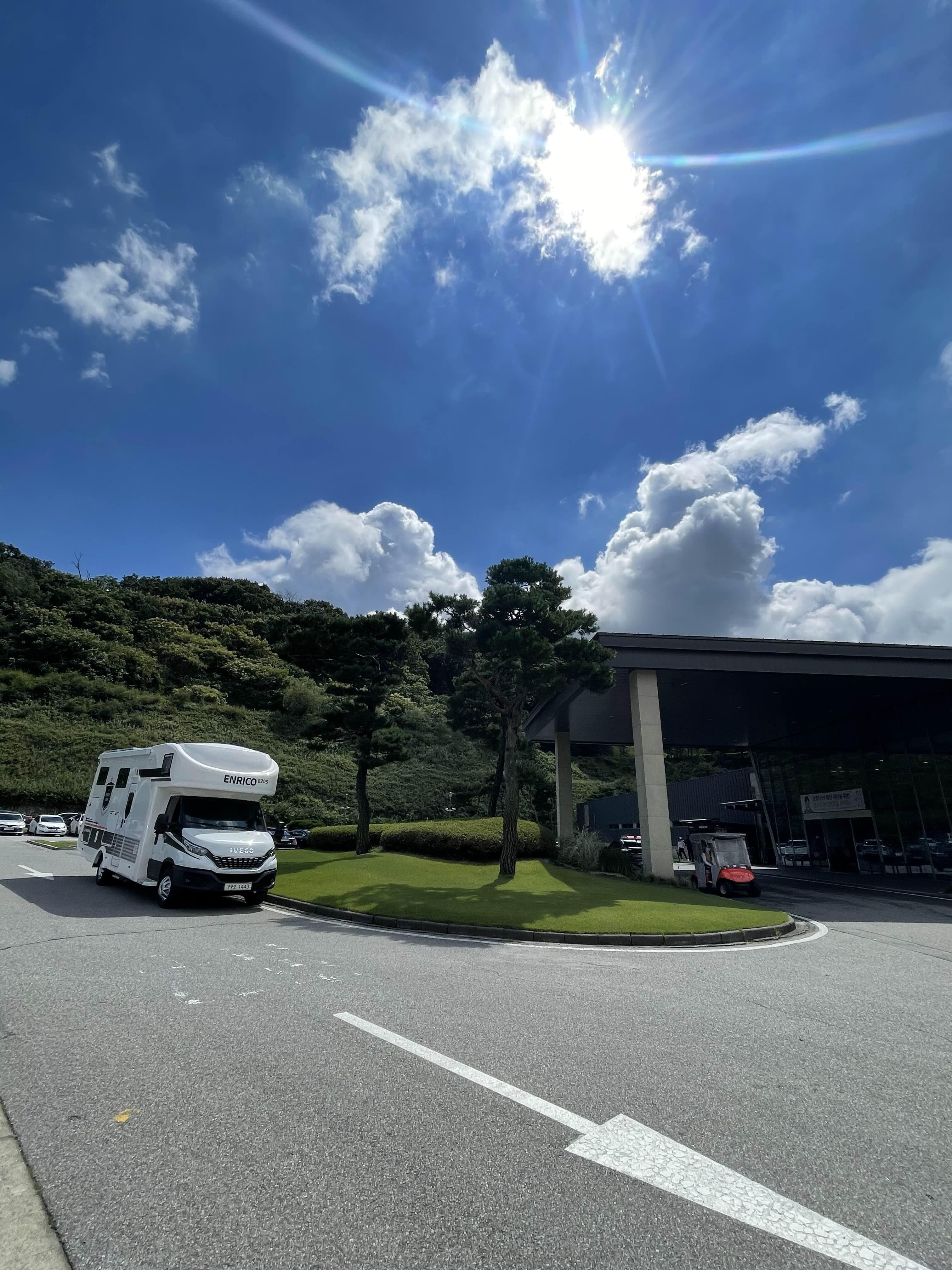 자, 그럼 스타트 지점부터 그린과 주변 환경을 보여드리겠습니다. 락커룸에서 옷을 갈아입고 스타트지점에서 캐디님과 카트를 기다립니다. 저는 힐코스부터 시작이었습니다.