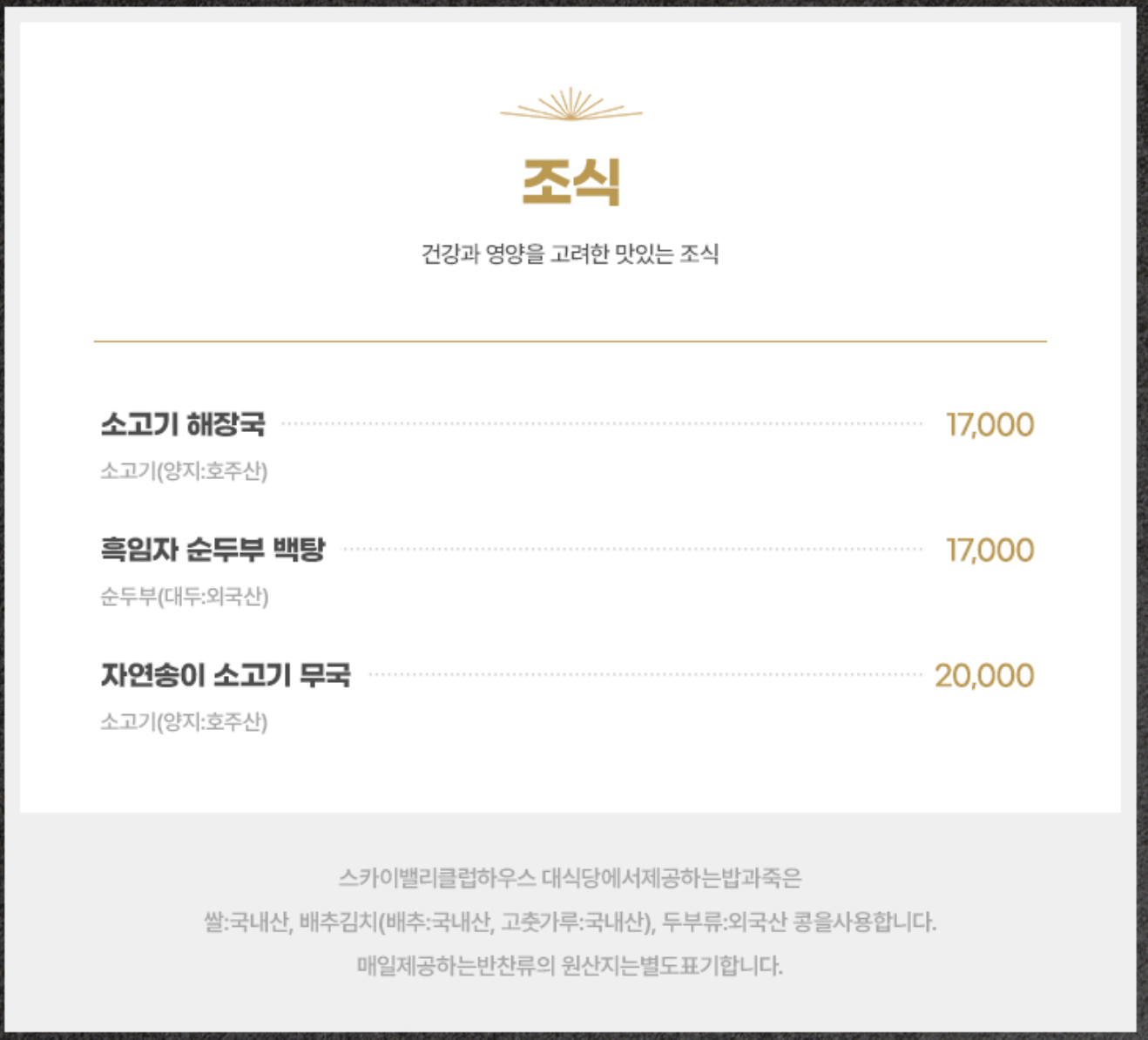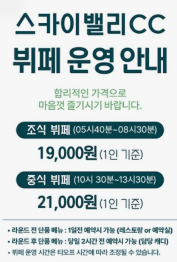 저는 2부 티업으로 17만 원에 라운드를 진행했습니다. 스카이밸리 CC는 다른 구장과 다르게 특별한 점이 있습니다. 조식이 단 메뉴가 아닌 뷔페식으로 되어있습니다. 스카이밸리는 조식, 중식 모두 뷔페로 운영되고 있습니다. 조식을 뷔페로 하는 곳은 처음 와보았는데 맛도 괜찮았고 가격대비 좋았습니다. 가격은 19,000원입니다. 그런데 많이 먹으면 또 공칠 때 힘들 수 있으니 적당히 먹고 라운드를 해야겠죠?