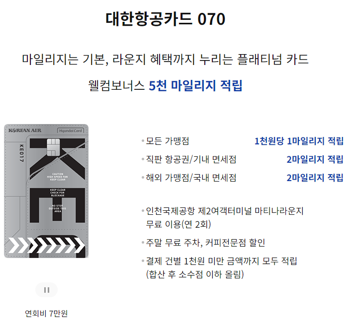 대한항공 마일리지를 급하게 쌓아야 해서 현대카드인 대한항공카드 070을 발급받았습니다. 이유는 웰컴 마일리지로 5000 마일리지를 주기 때문이었어요. 그동안 수많은 비행이 있었지만 이제는 대한항공만 이용하려고요. 집중공략.