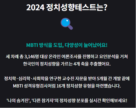 요즘 유명한 MBTI 방식을 통해 나 자신의 성향을 알아보듯, MBTI방식을 도입한 2024년 나의 정치 성향테스트를 받아보세요.