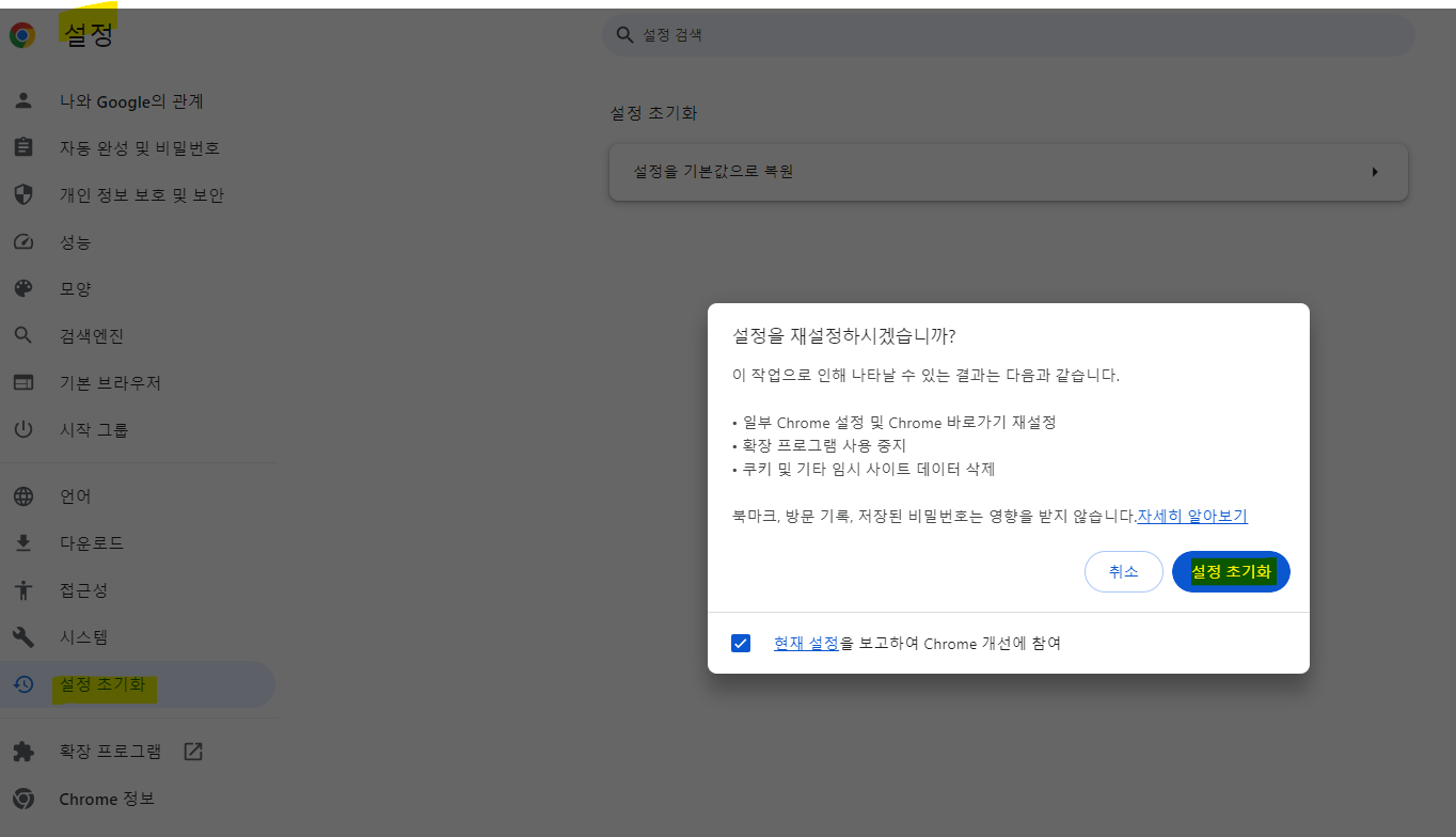 * 구글 크롬 설정으로 이동 > 설정 > 설정 재설정 > 설정 초기화 선택