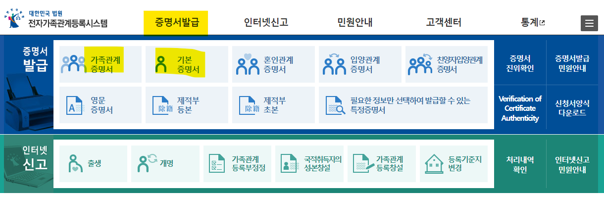 준비물 : pc에 기본증명서, 가족관계증명서