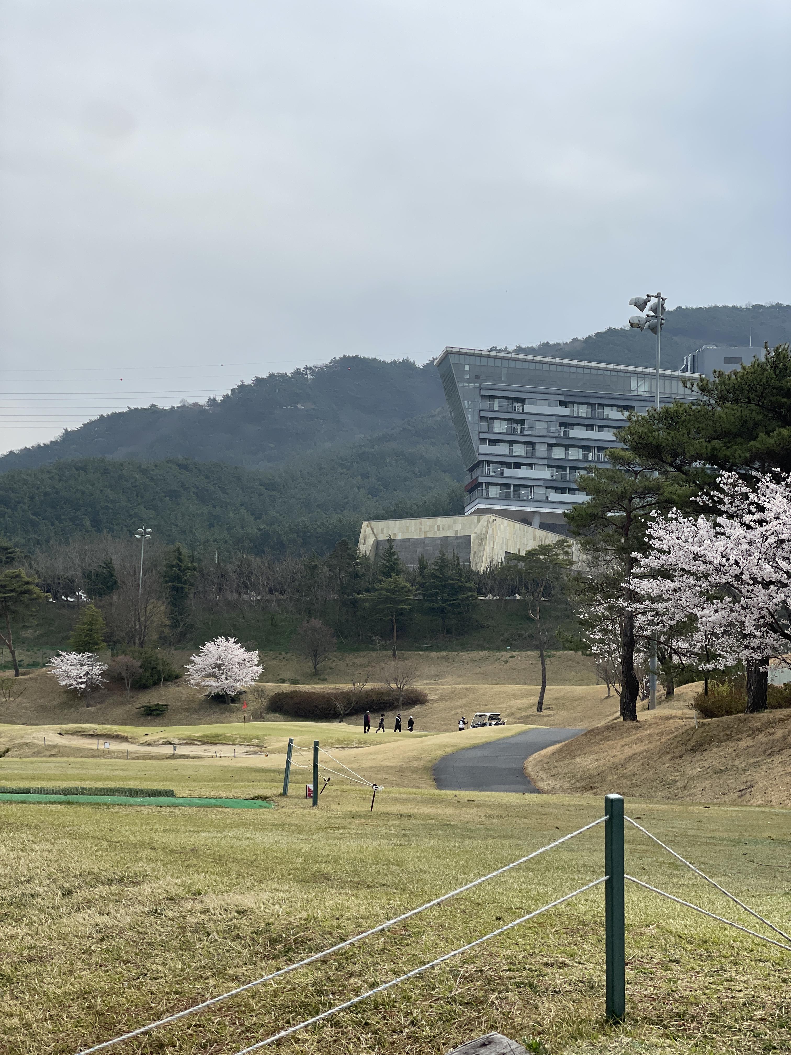 벚꽃이 만개한 잔디를 따라 걸으면서, 마치 한폭의 그림을 보는 듯한 느낌을 받았습니다. 코스 주변의 경치도 매우 아름다워서 라운딩하는 동안 동반자들과 힐링이 되었습니다.