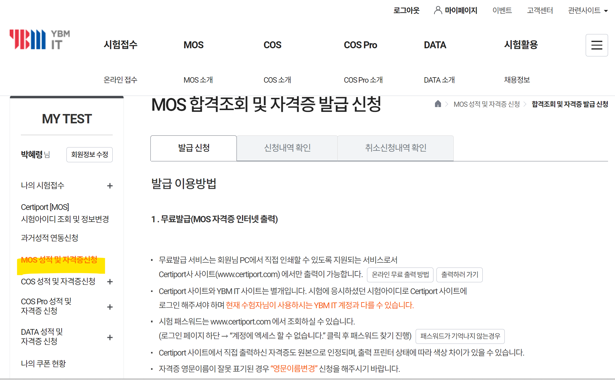 MOS 자격증 조회 방법