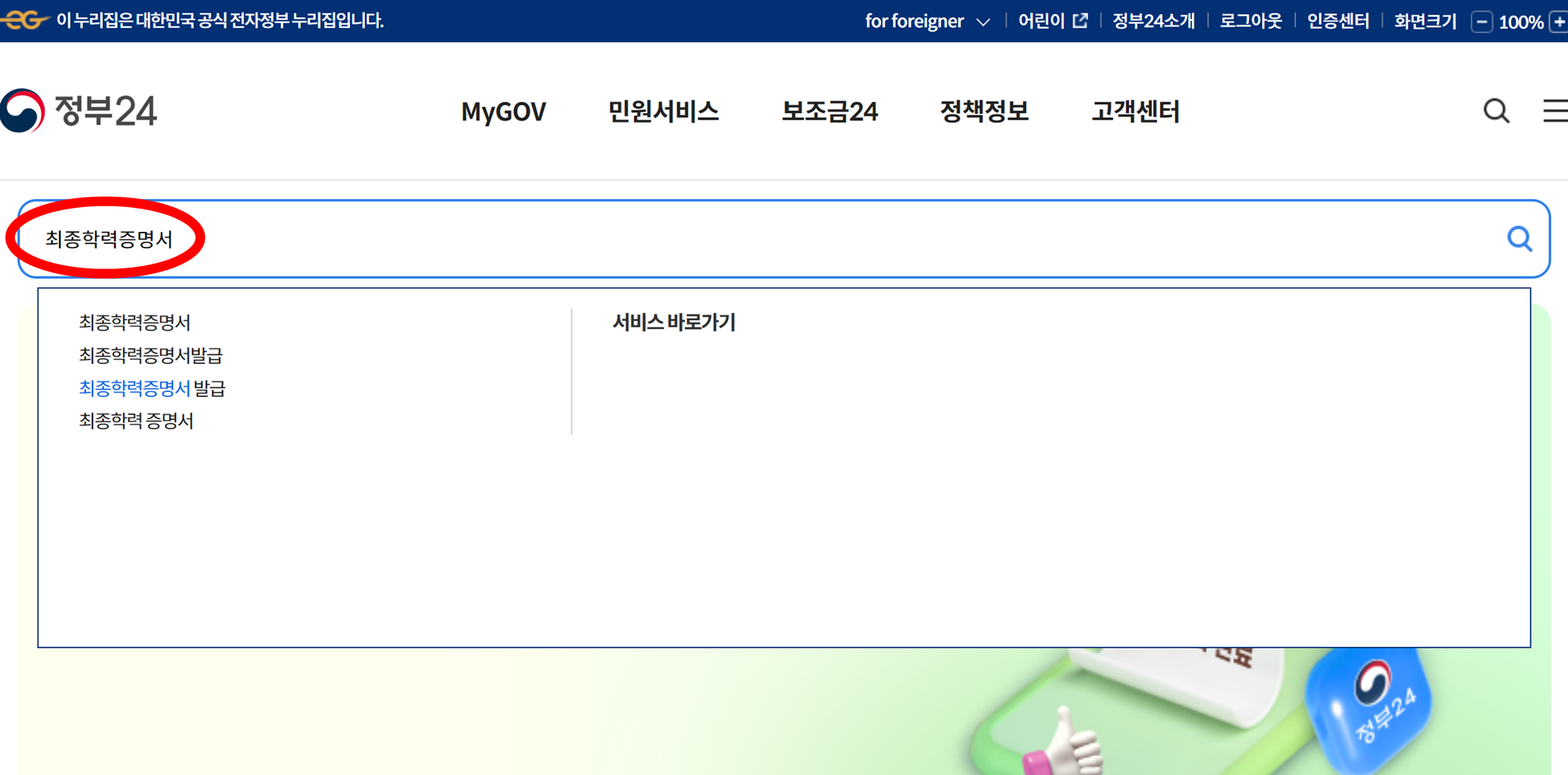 2. 메인 검색창에 '최종학력증명서'라고 검색