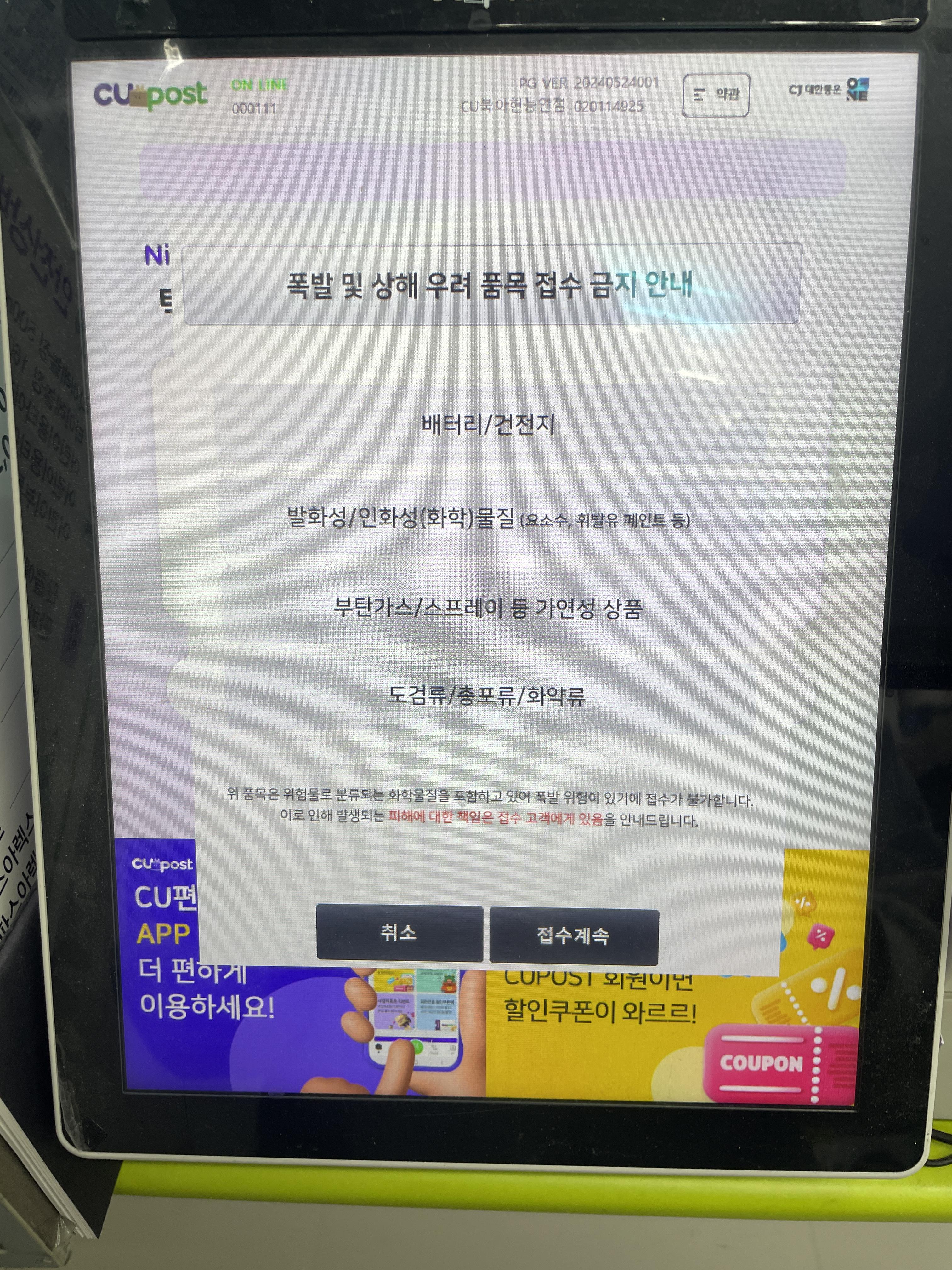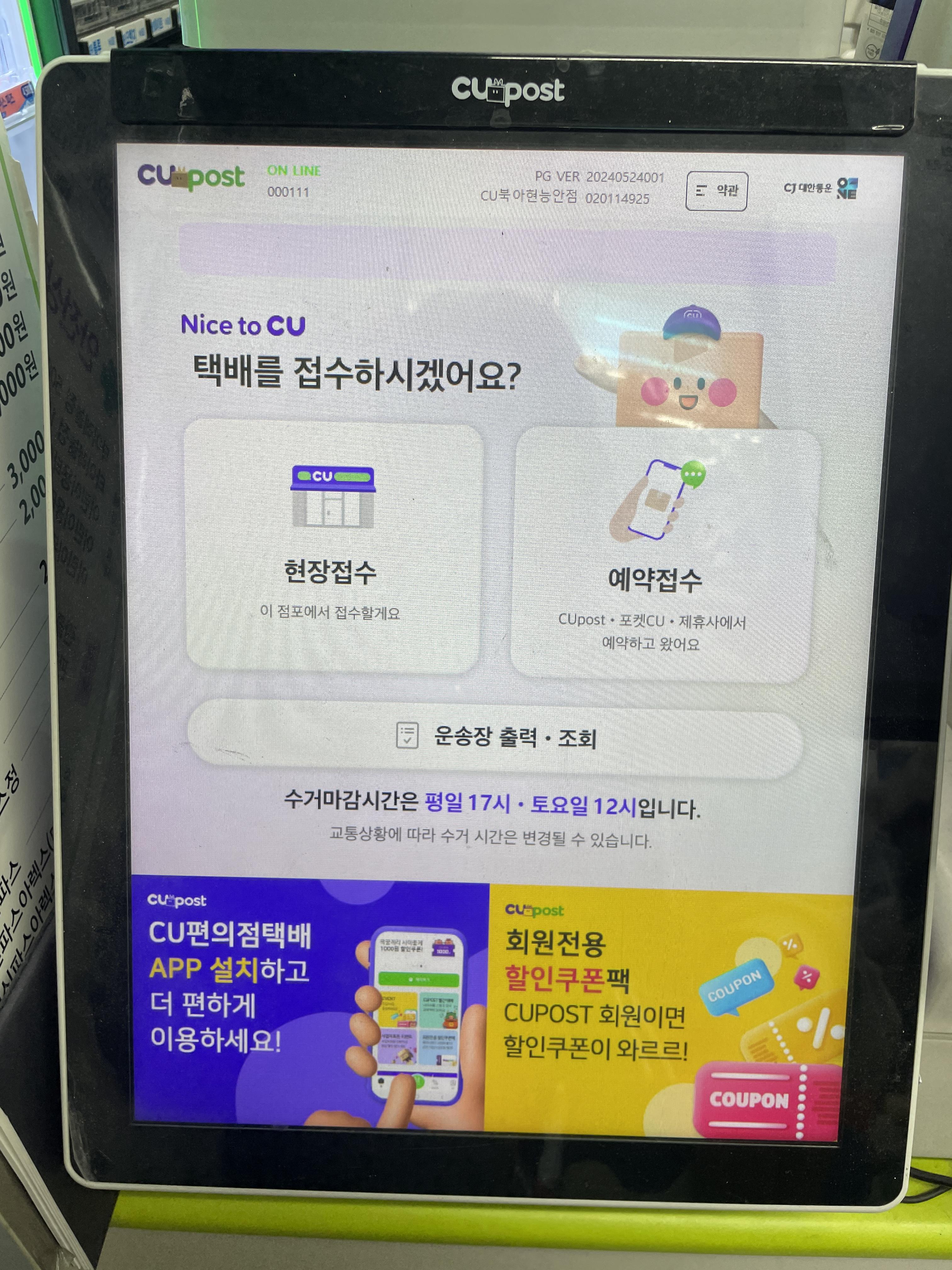 (위치는 받는사람 거주지 근처 cu로 등록할 것!) > 영수증 출력 > 매장직원에 결제 > 접수 완료