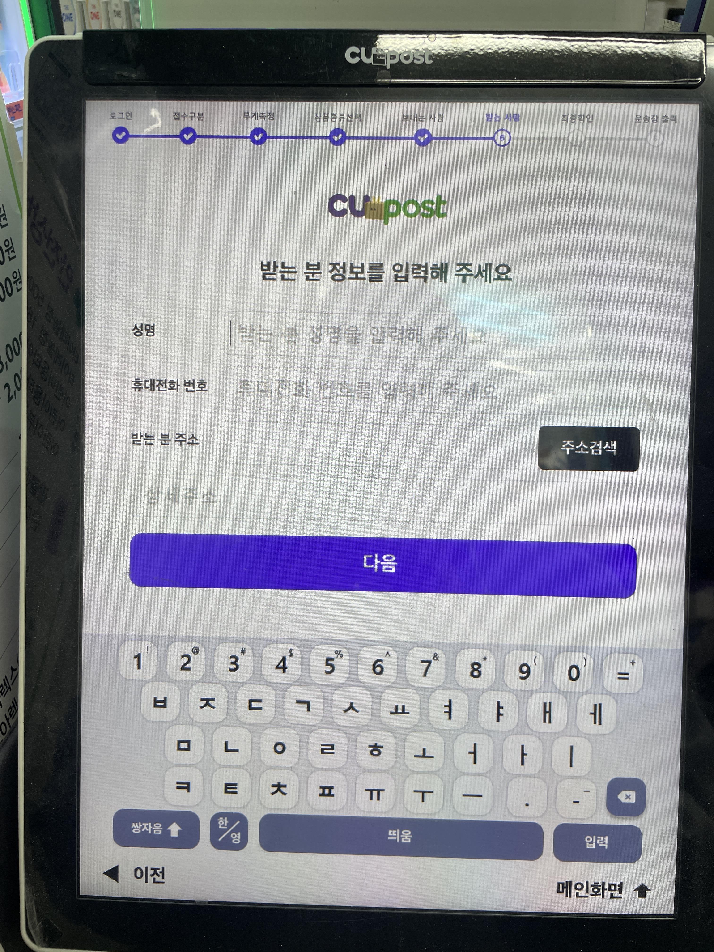 집에서 미리 박스에 포장하기 > 근처 cu편의점 방문 > 기기에 중량재기 > 수/발신인 정보 입력