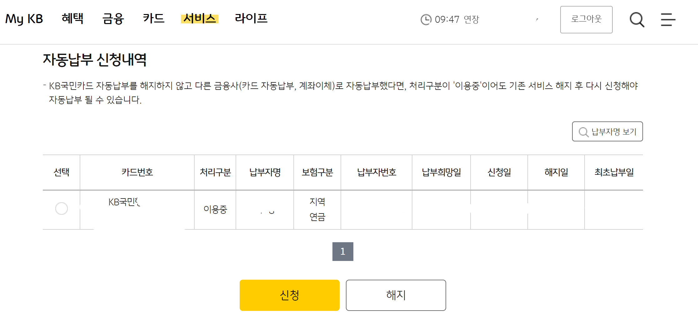 국민카드 홈페이지 > 서비스 > 자동납부 신청내역 > 자동납부 해지
