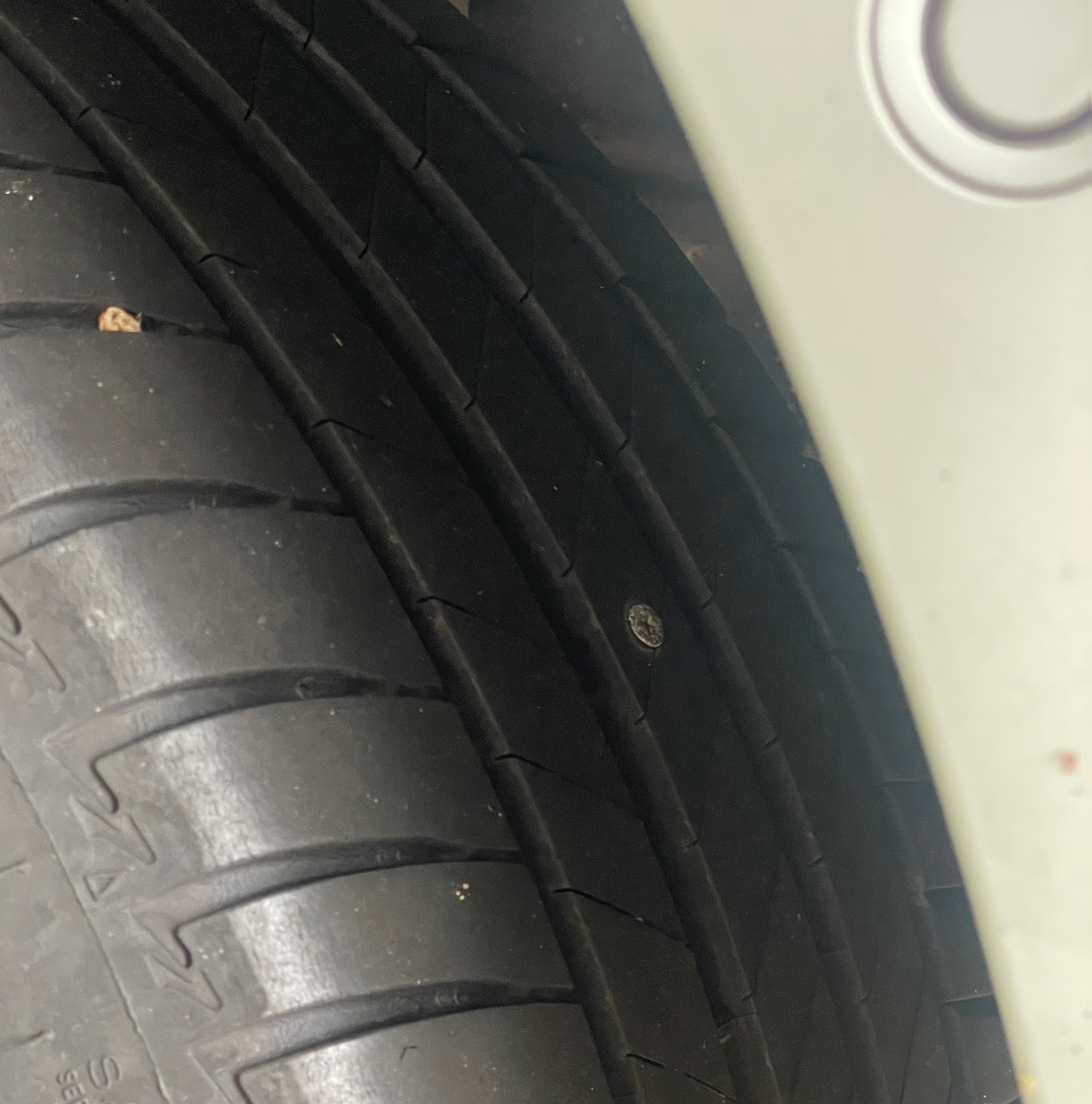 뒤쪽 바퀴에 못이 정확하게 박혀있었어요. 타이어를 교체해야 할까 봐 조금 걱정되었습니다.