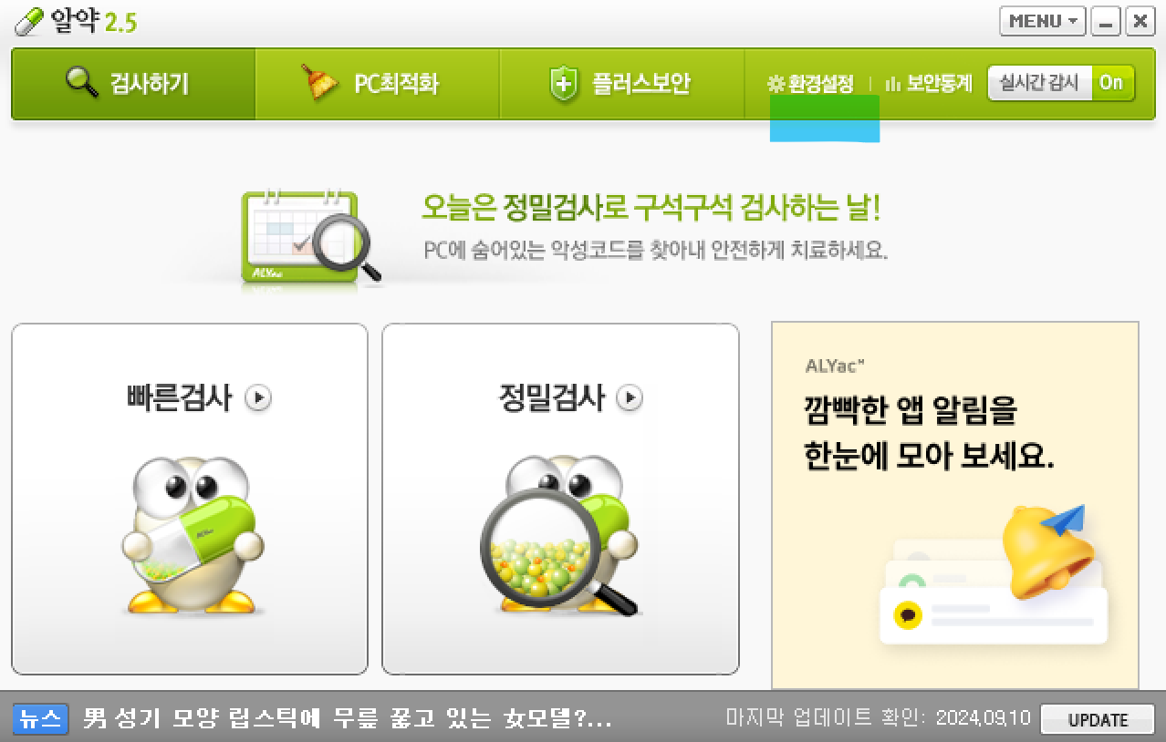 1.알약프로그램 실행 환경설정 업데이트 설정 끄기>작업설정 업데이트설정 알림 설정체크박스모두해제 적용