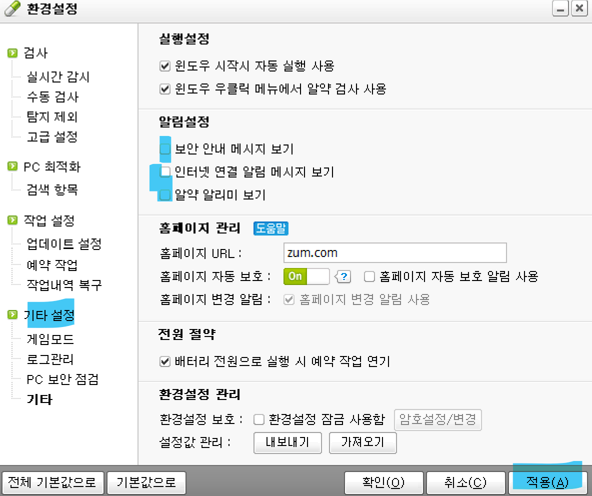 2. 환경설정 기타 알림 설정 체크박스 모두 해제 (보안 안내 메시지 보기 / 인터넷 연결 알림 메세지 보기 / 알약 알리미 보기)
