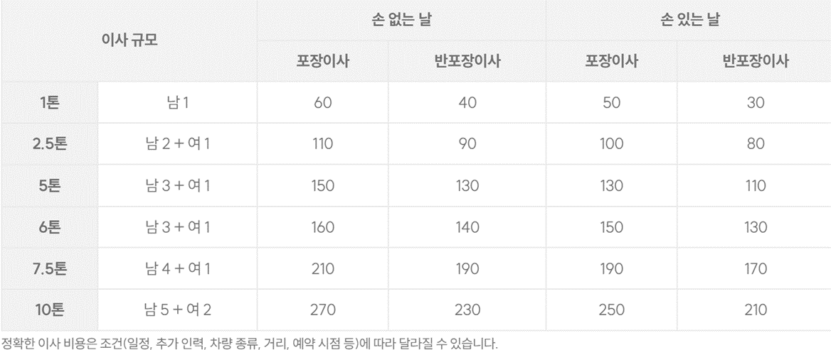 - 이사 거리: 이사하는 거리와 짐의 양도 비용에 영향을 줍니다. 장거리 이사라면 추가 요금이 붙습니다.