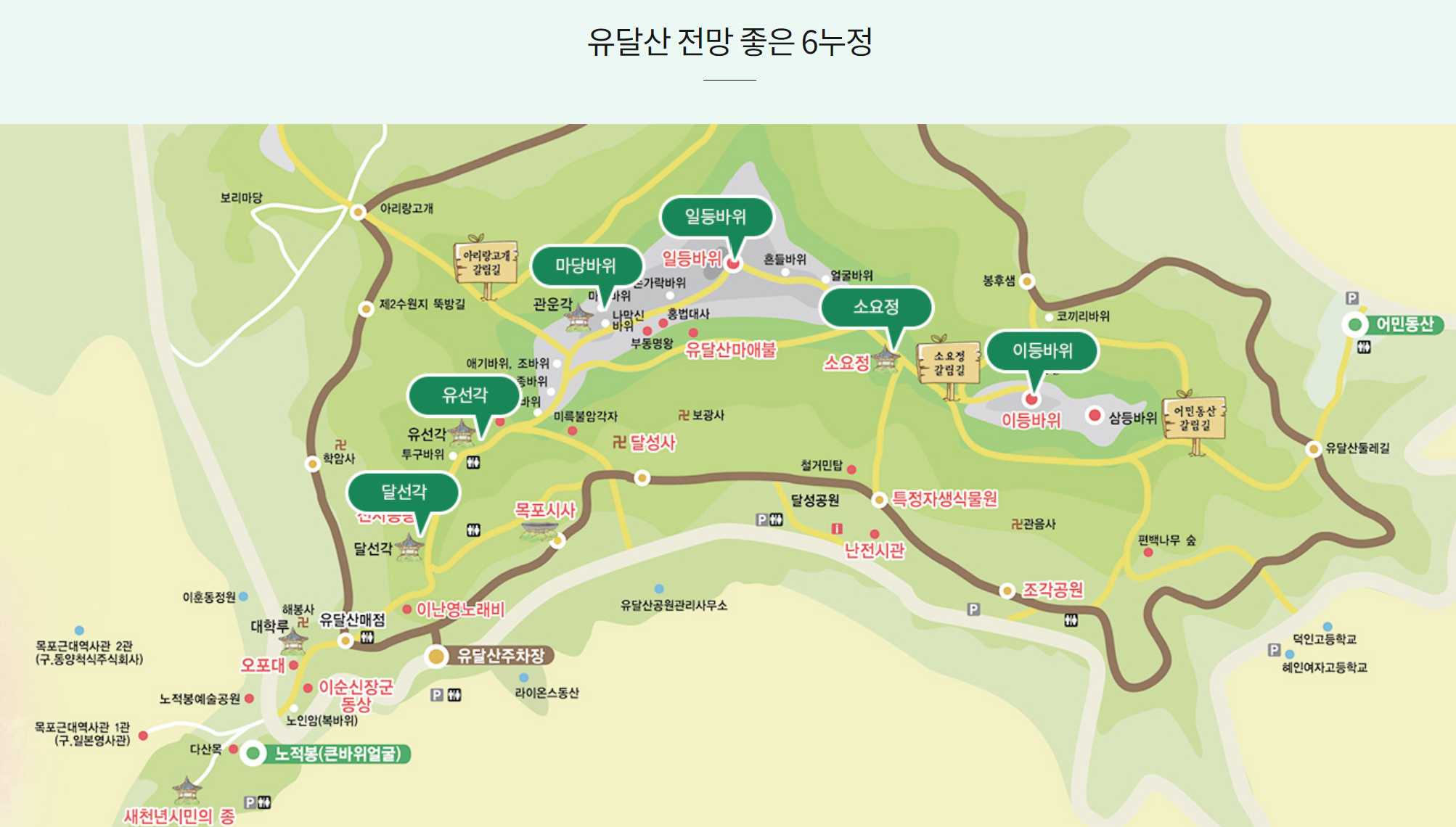 유달산의 6누정은 여러 전망대 중 하나로, 특히 아름다운 경관을 감상할 수 있는 장소입니다. 이곳에서는 목포 시내와 바다, 그리고 주변 섬들의 경치를 한눈에 볼 수 있어 많은 사람들이 찾습니다. 6누정에 가면 사진도 많이 찍고, 주변의 자연을 즐기기에 좋은 장소입니다.