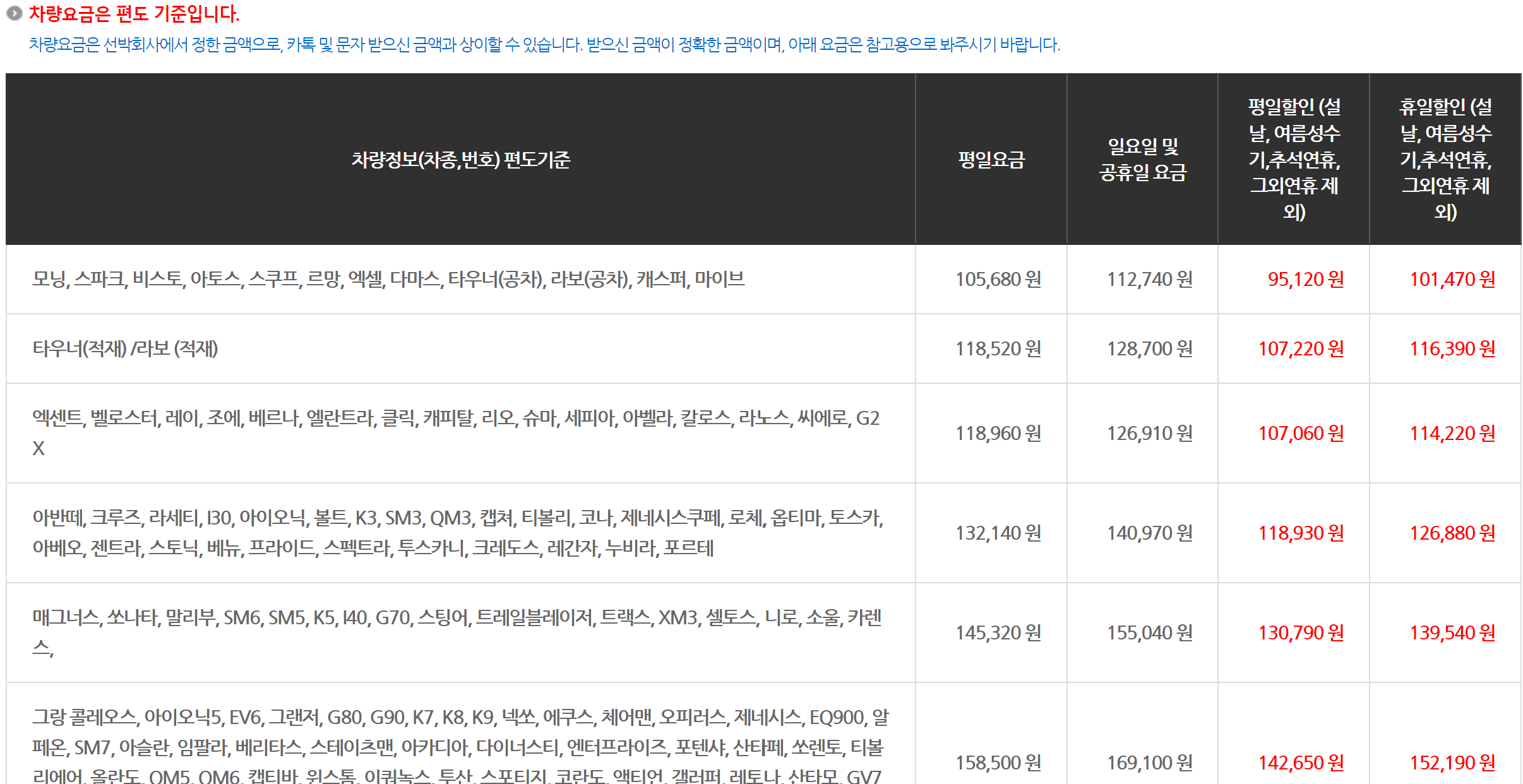 나의 차량 종류에 따라 배 탁송요금을 알아보세요.