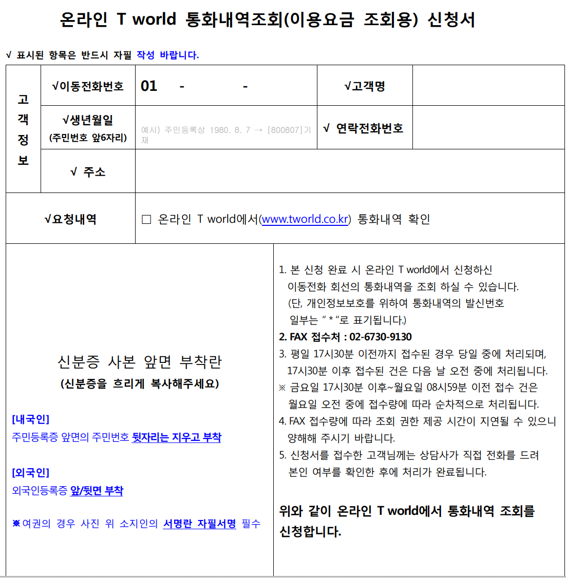 SK텔레콤 통화내역 조회를 위해 T월드 홈페이지에서 신청서를 다운로드하고, 명의자가 직접 작성한 후 신분증 사본과 함께 팩스(02-6730-9130)로 제출해야 합니다.