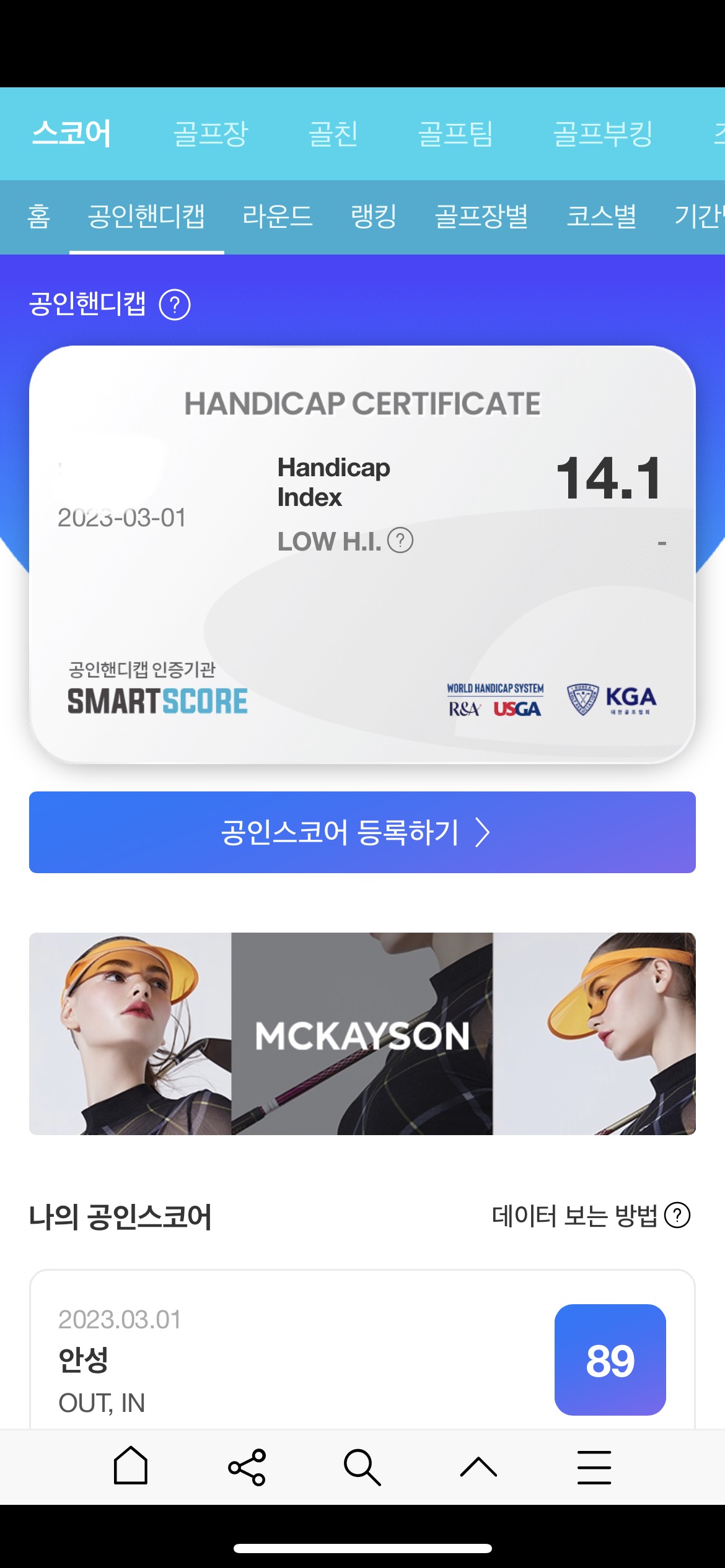 스마트 스코어에서 공인 핸디캡을 골퍼의 핸디캡을 공식적으로 인증할 수 있습니다. 바로 스마트 스코어 공인 핸디캡입니다.