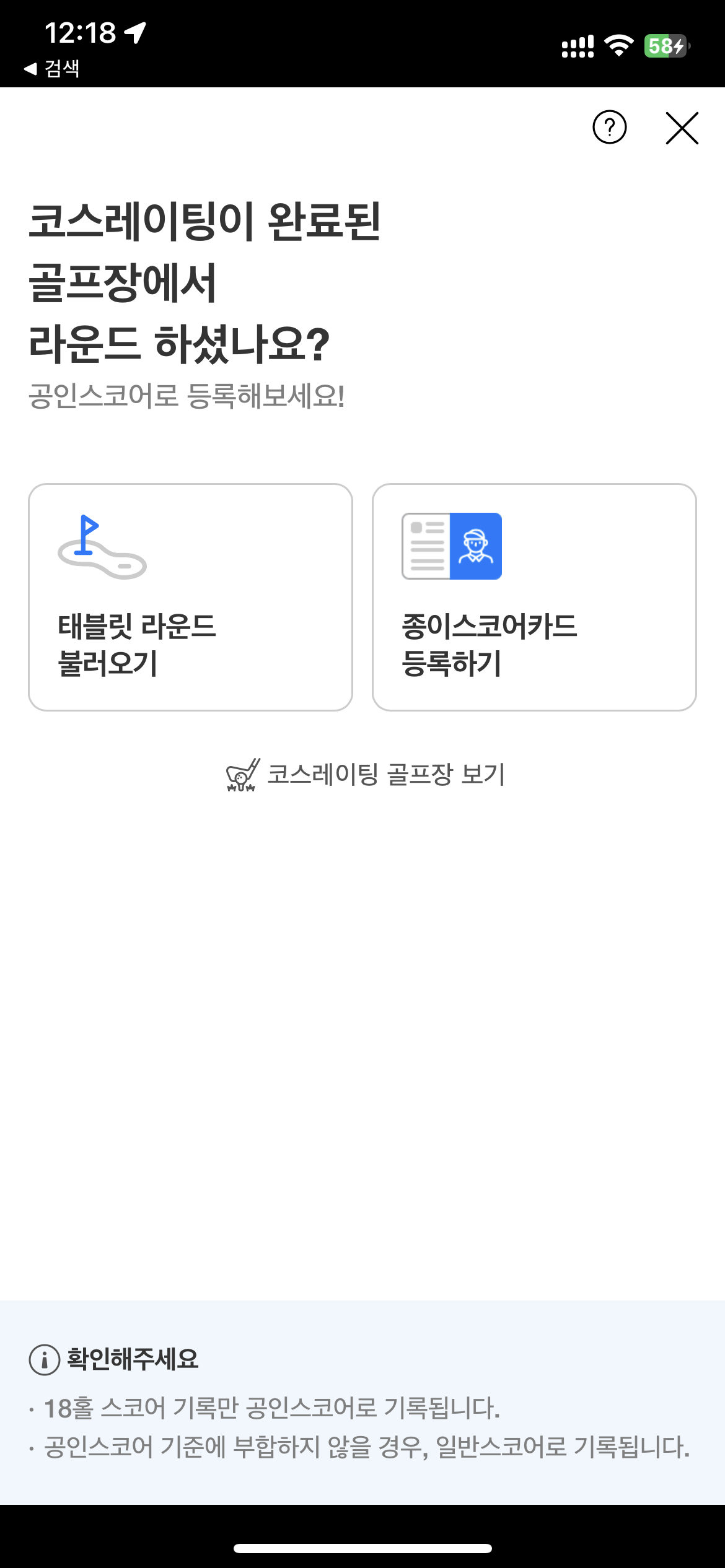 코스레이팅이 완료된 골프장이서 라운드를 할 경우, 태블릿이나 종이스코어로 공인스코어 등록이 가능합니다.